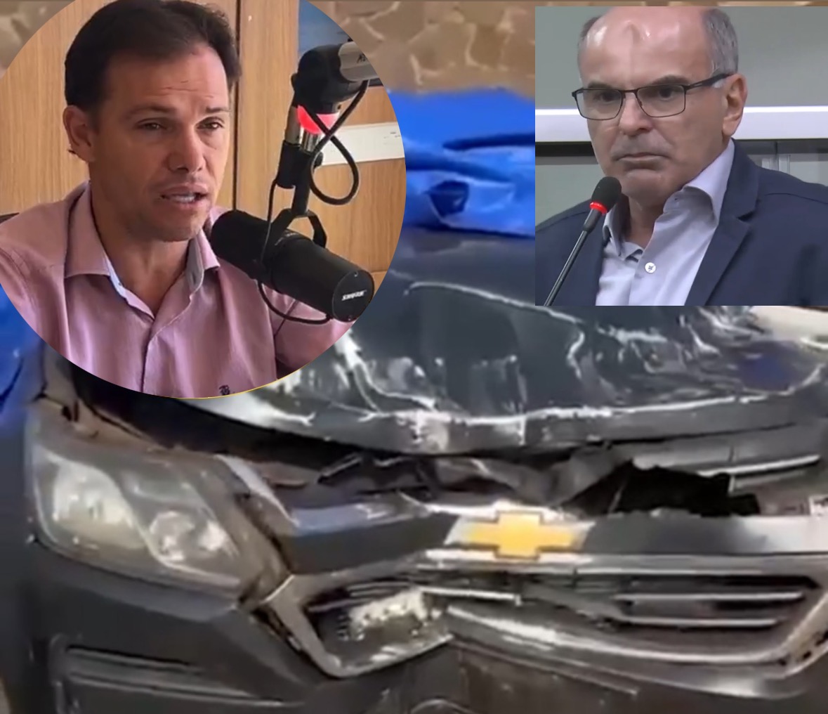 Segundo a denúncia, ao chegar em sua residência, já desacompanhado da namorada, o prefeito teria sido abordado pelo marido da servidora pública e sua acompanhante, o que gerou uma perseguição em alta velocidade, tanto pelas ruas da cidade, quanto pela rodovia, BR-497 (sentido Minas Gerais), resultando em um choque violento contra a placa de entrada da fazenda Bela Olinda, curiosamente, do rival dele, deputado João Henrique Catan (PL).